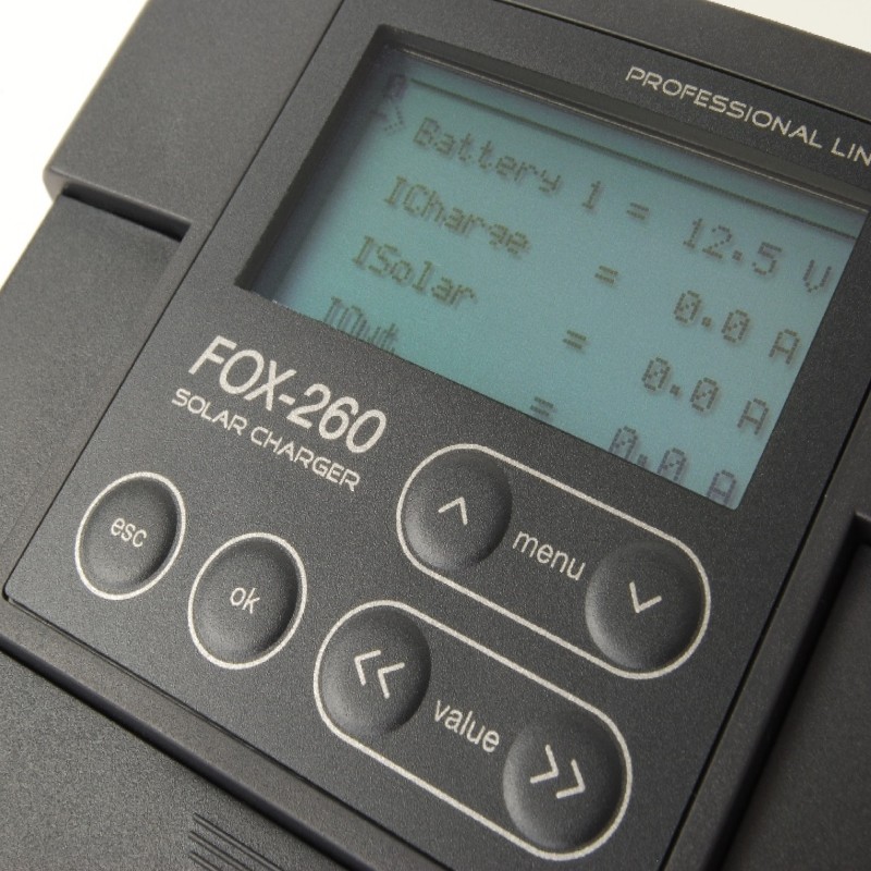 FOX-260, FOX-260 Li in FOX-360 so programirljivi regulatorji polnjenja z integriranim LCD zaslonom. Zaslon ima osvetlitev ozadja. Številke ostanejo izredno velike, tako da jih je mogoče brati tudi z razdalje. FOX-260, FOX-260 Li in FOX-360 so regulatorji polnjenja za za polnjenje enega akumulatorja ali pa dveh ločenih, s solarnimi paneli max. do 20 A. Primerni za AGM, GEL in svinčeve baterije.